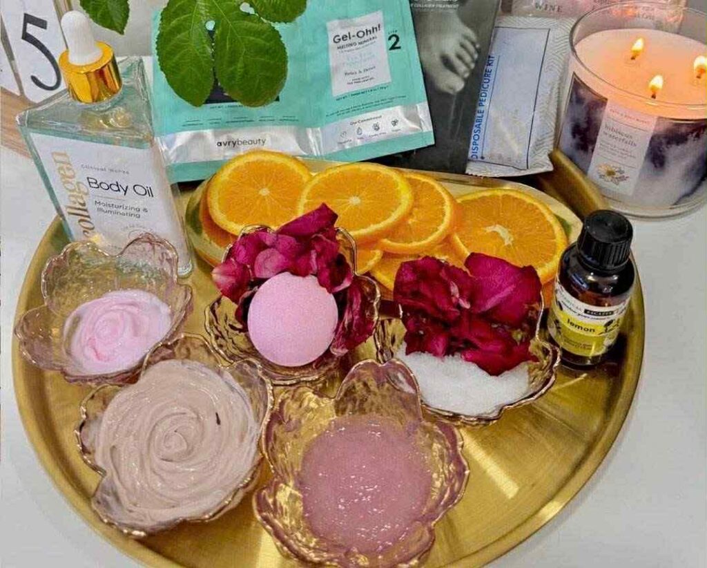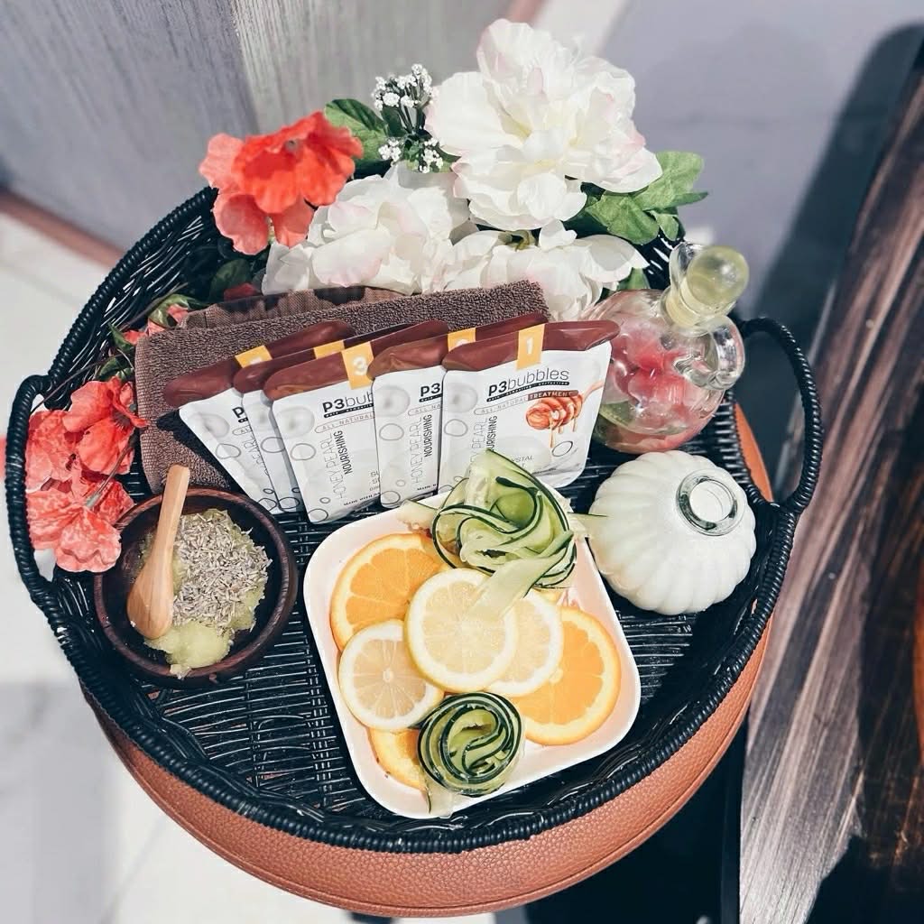 Indulge in a champagne soak with rose petals, followed by a milk and honey citrus scrub that nourishes skin and fights aging by neutralizing free radicals. Enjoy sea salt exfoliation, a collagen mask, and collagen cream, finishing with deeply moisturizing collagen socks.